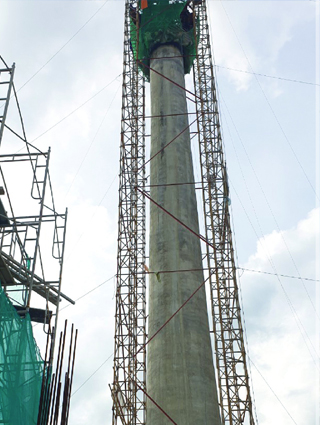 Do đặc thù thi công ống khói với thân nhỏ, chịu tải trọng lớn của mâm sàn nên PHCONS thường dùng 1 cụm thang tải đặt tại trung tâm để giữ ổn định tránh các chuyển vị ngang, xoay hay lệch mâm sàn trượt. Tuy nhiên biện pháp này chỉ thực hiện được với các ống khói có đường kính trong lòng đạt 2,70M. Với ống khói Nhà máy Lốp xe Jinyu - Tây Ninh thì mức độ phức tạp cao hơn do đường kính lòng trong tại đỉnh là 2,40M. Ngoài ra ống khói này còn thay đổi độ nghiêng 3 lần nên đòi hỏi việc thi công phải được kiểm tra cẩn thường xuyên, cẩn thận để đảm bảo độ chính xác.