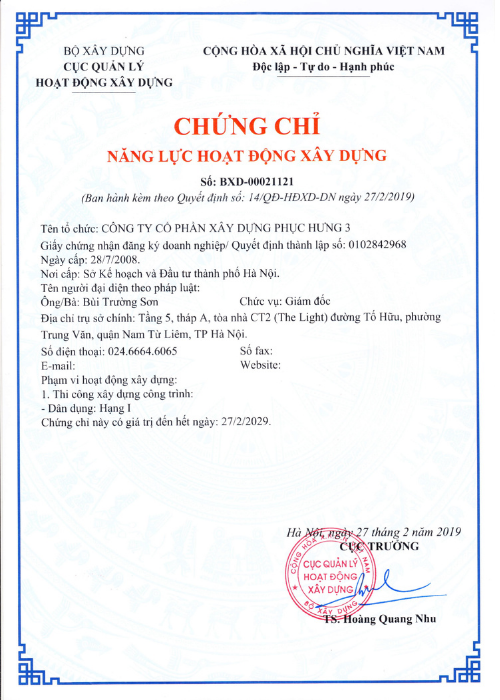 PHCONS đã được Cục quản lý Hoạt động Xây dựng cấp Chứng chỉ năng lực hoạt động xây dựng Hạng 1, số BXD: 00021121, ban hành kèm theo Quyết định số 14/QĐ-HĐXD-DN ngày 27/02/2019.